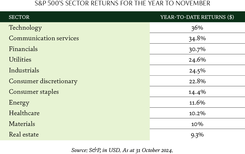 Central banks, notably the US Federal Reserve (Fed), initiated interest rate cuts in the latter half of 2024 as inflation continued to fall; now down markedly from its heady levels in late 2022. With inflation diminishing, down to 2.4% for the year to September, rate cuts were more aimed to stabilise economic growth, and were crucial in restoring market confidence against early signs of a softening labour market. As a result, markets responded with equal stability, particularly in sectors like technology and consumer goods, which historically have tended to be more sensitive to changes in consumer spending.